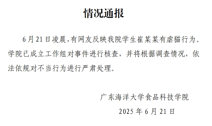 新京报讯 6月21日,广东海洋大学食品科技学院发布情况通报,详情如下: